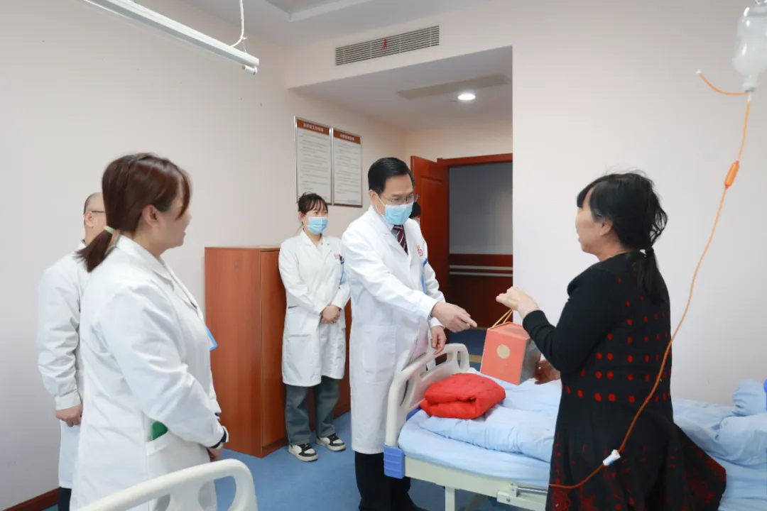 今天上午9点,西安附医中医医院刘锐院长、医疗周泉院长携科室医护人员,带着满满的温情与祝福,深入病房对住院患者、门诊患者进行慰问。为增添节日的喜庆氛围,并传达医院深深的关怀,我们精心准备了新年小礼物,寄托着新的一年里福气满满、健康平安的美好愿景。