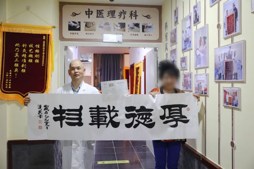 张阿姨说,她以前在其他医院一扎针,感觉不适,从此惧怕扎针。经孙三强主任给她扎了以后,没有不适感,感觉良好。此外,理疗科的梁大夫给她按摩,她也觉得很好。阿姨说:“你们医院是我最后一个选择的医院,以后他也不去其他医院了。”为了表达自己的感谢,阿姨特地让其书法家朋友,中国书画家曾汉民手书“厚德载物”四字赠与孙三强主任。